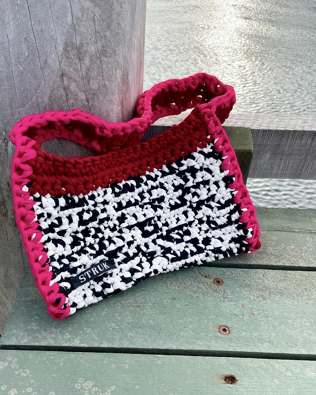 Exclusive designer bag from STRUK in black and white with red/pink.