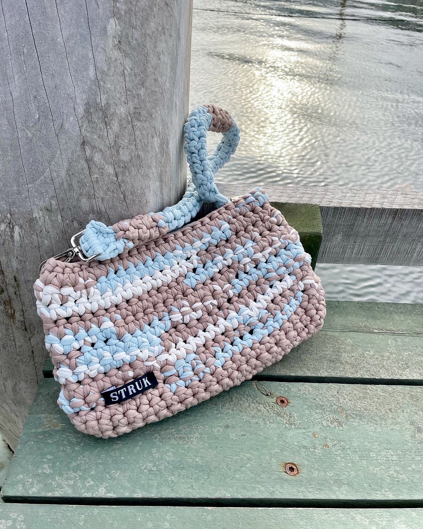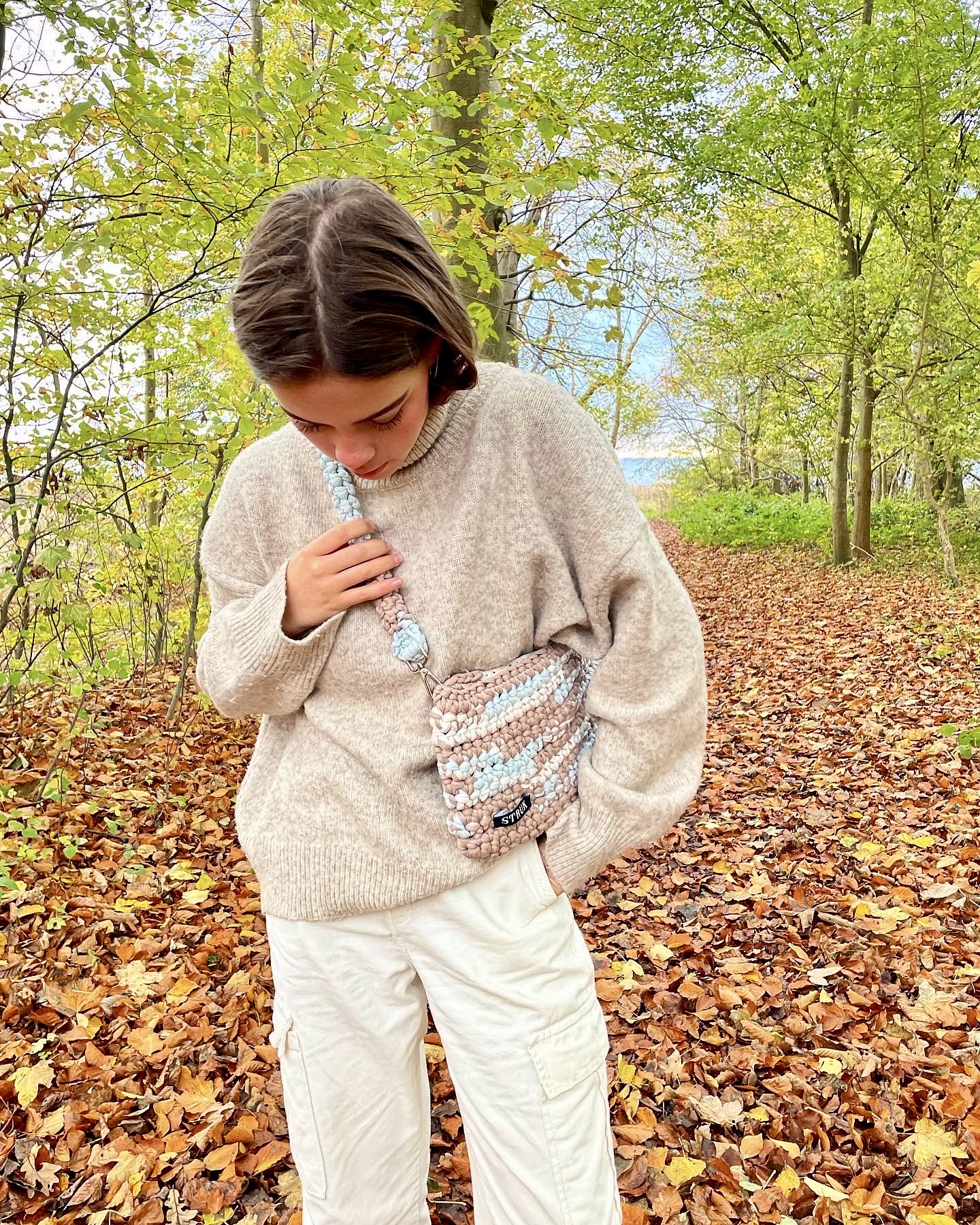 The bag is handmade and produced from recycled yarn in high quality. The bag’s sustainable textiles contain elastane and it is therefore possible to expand. The bag can contain the small essentials of the women’s bag.